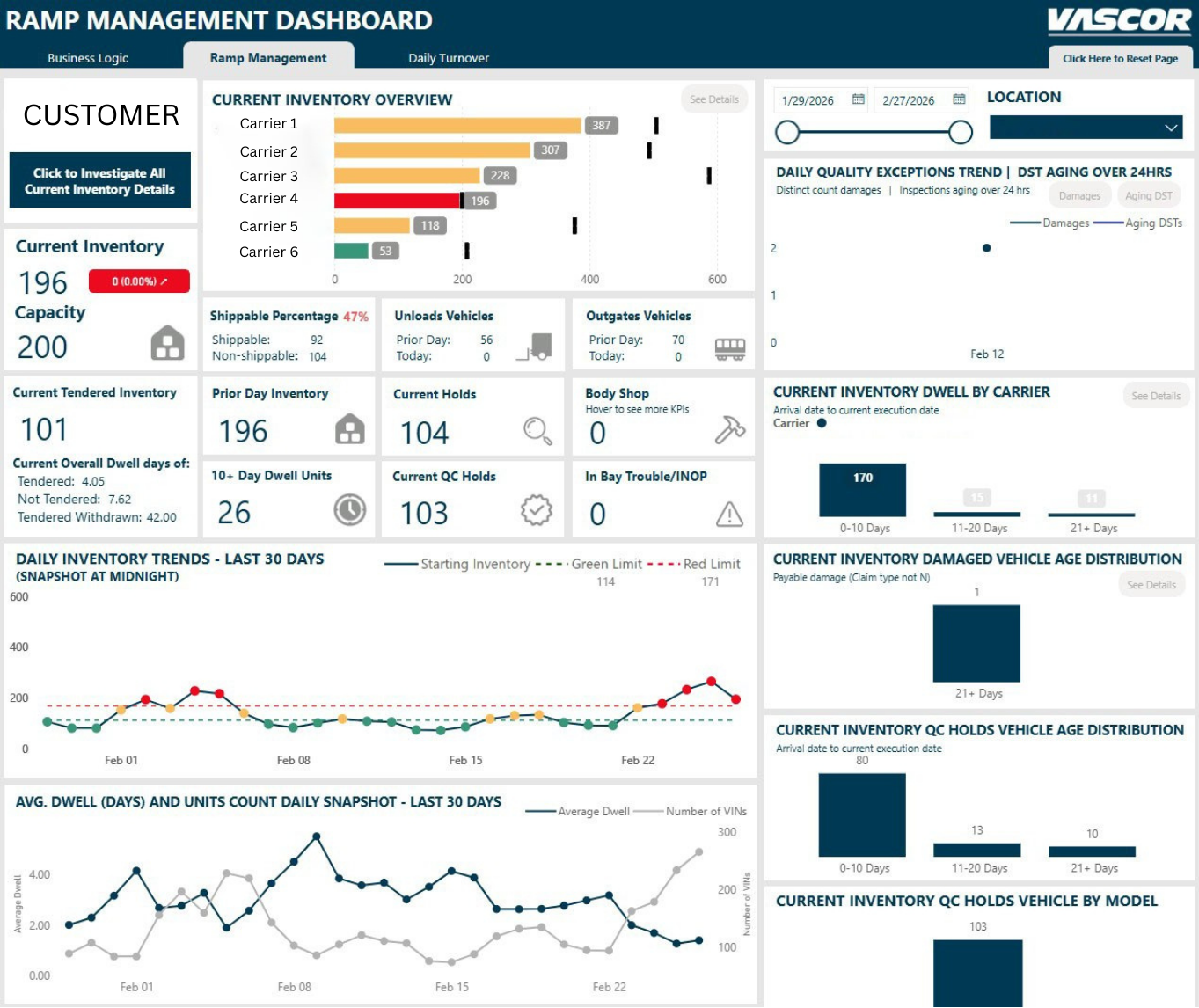 Live visibility into finished vehicle ramp operations — unit counts, bay status, dwell times, and processing throughput — enabling OEM and ramp teams to manage outbound flow proactively.
